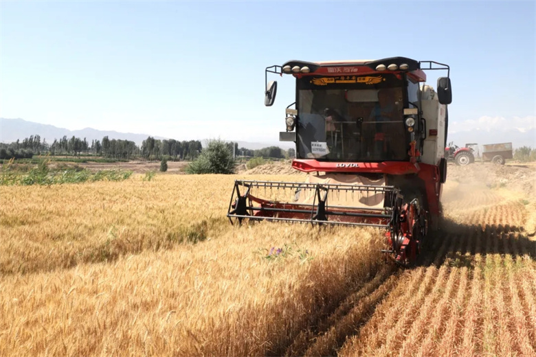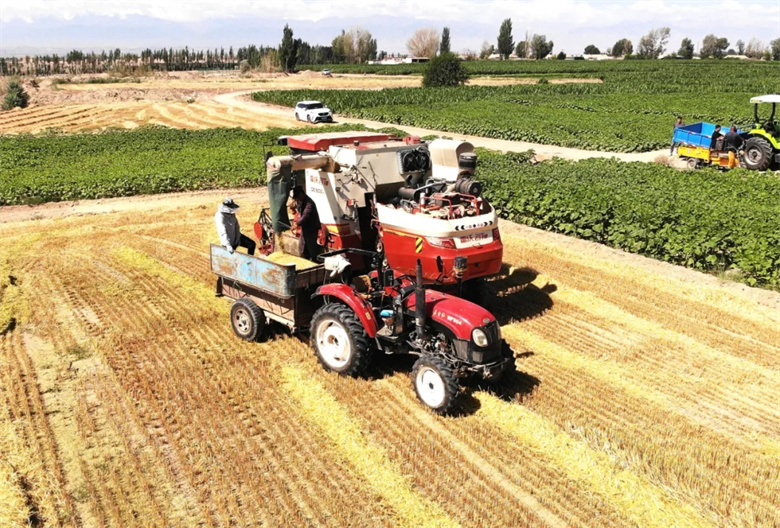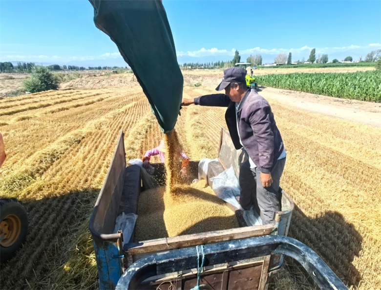 望着麦粒堆成的“小山”,村民们脸上洋溢着丰收的喜悦。“我种了3亩的小麦,从播种到收获全程机械化作业,小麦长势好,颗粒饱满,按照当前的收割情况,预计每亩产量达1000斤左右。”骆驼城村村民王福说。
