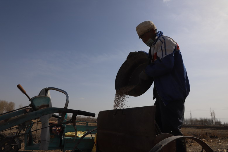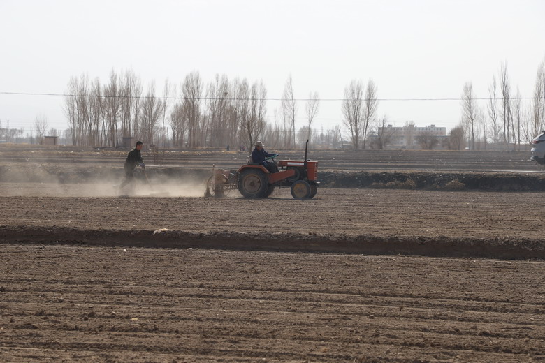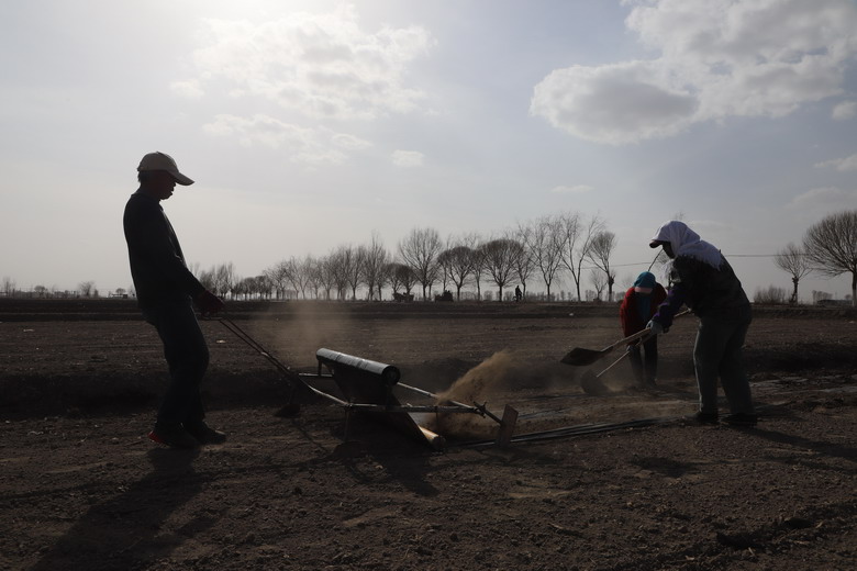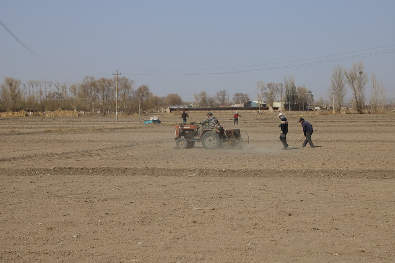 村民盛亮均说:“农时节气很重要,惊蛰节气播麦子,扎根深,麦苗壮,夏天不倒伏,扬花上米时颗粒饱满,产量有保障。”他家里种着20多亩地,两个儿子因为工作和路途的原因,无暇顾及春耕,侄子便主动搭手,帮他播种。盛亮均告诉笔者,人误地一时,地误人一年。他们村的地离河近,返潮早,地催人,容不得半点马虎,前几天冰碴地里种了4亩多孜然,今天再把5亩小麦播上,心里踏实多了,剩余的耕地则按计划种些“小制种”之类的作物,既保口粮又能增收,他的种植计划可谓周密而细致。