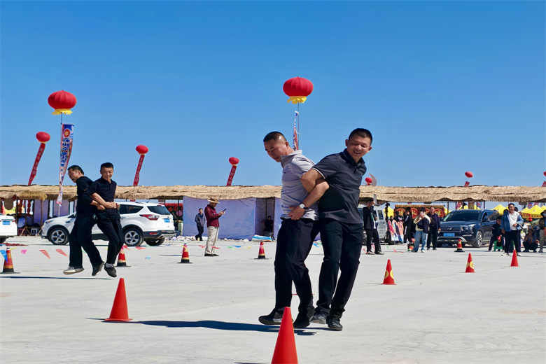 除特色农产品展示展销外,合黎镇还积极组织干部群众参与丰收节系列特色活动,全方位展现镇域农耕活力。在“农韵T台秀・鲜品潮登场” 环节,合黎镇代表队以镇内农产品为创意核心,设计出融入本地农产元素的服饰造型,通过T台走秀的形式,让农产品“活”起来,生动展现合黎镇农耕文化魅力。在农民趣味运动会上,合黎镇参赛队员精神饱满,积极参与辣椒投掷、扁担挑粮赛、双人背瓜跑等富有农耕特色的项目,在欢声笑语中比拼竞技,既展现了新时代合黎镇农民的精气神,也让现场观众感受到丰收的喜悦与乡村生活的乐趣。