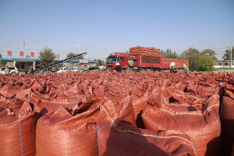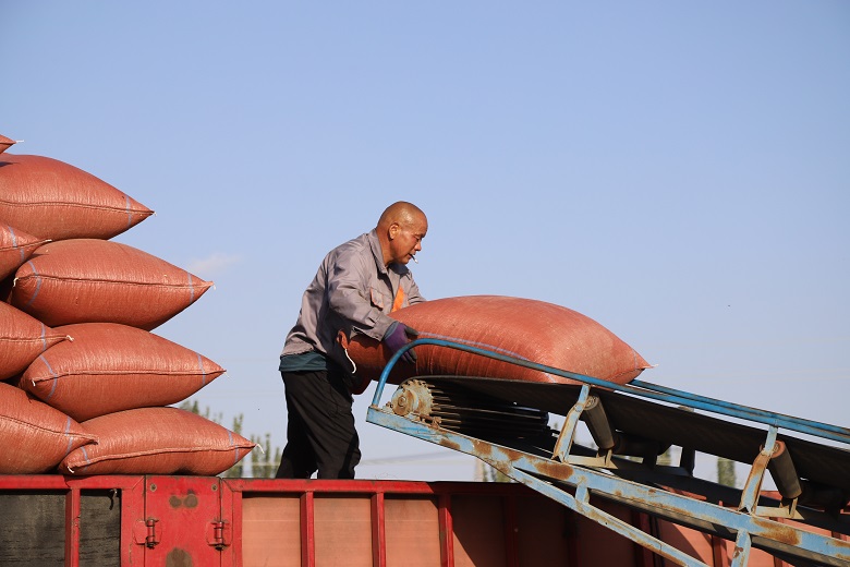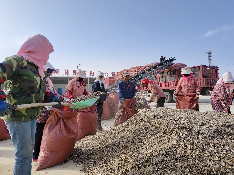 “我们村上有900多亩制种葵花,今天晾晒装袋的是我种的300亩。晒好装车后直接运往酒泉种子公司,亩产量能有120多公斤,按照一公斤32块的价格收,不愁销路。”义和村种植大户张世红说。