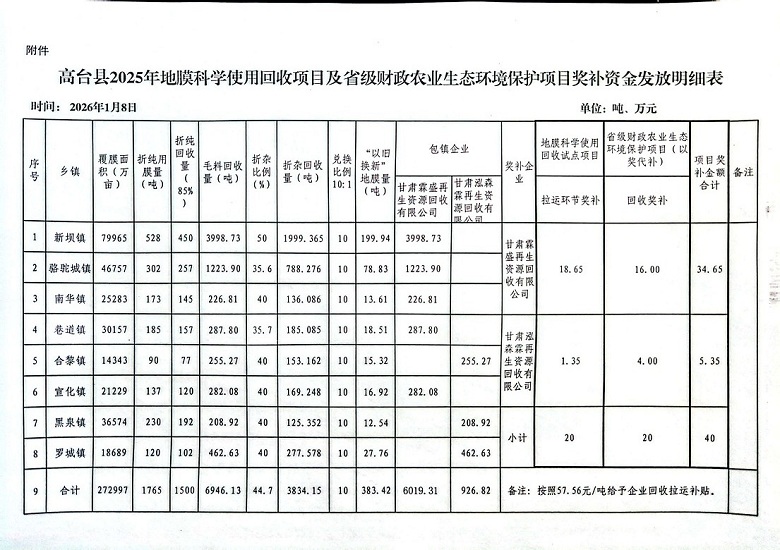 高台县农业农村局关于2025年地膜科学使用回收项目及省级财政农业生态环境项目以奖代补资金的公示