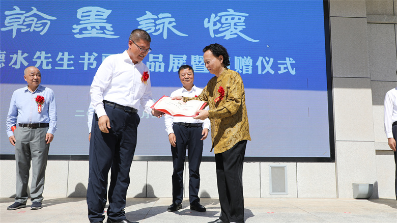 仪式上,张龙、王德水共同为高台尚贤书画院揭牌。武汉章向王德水颁发高台尚贤书画院名誉院长聘书,王德水先生向中国工农红军西路军纪念馆捐赠书画作品。