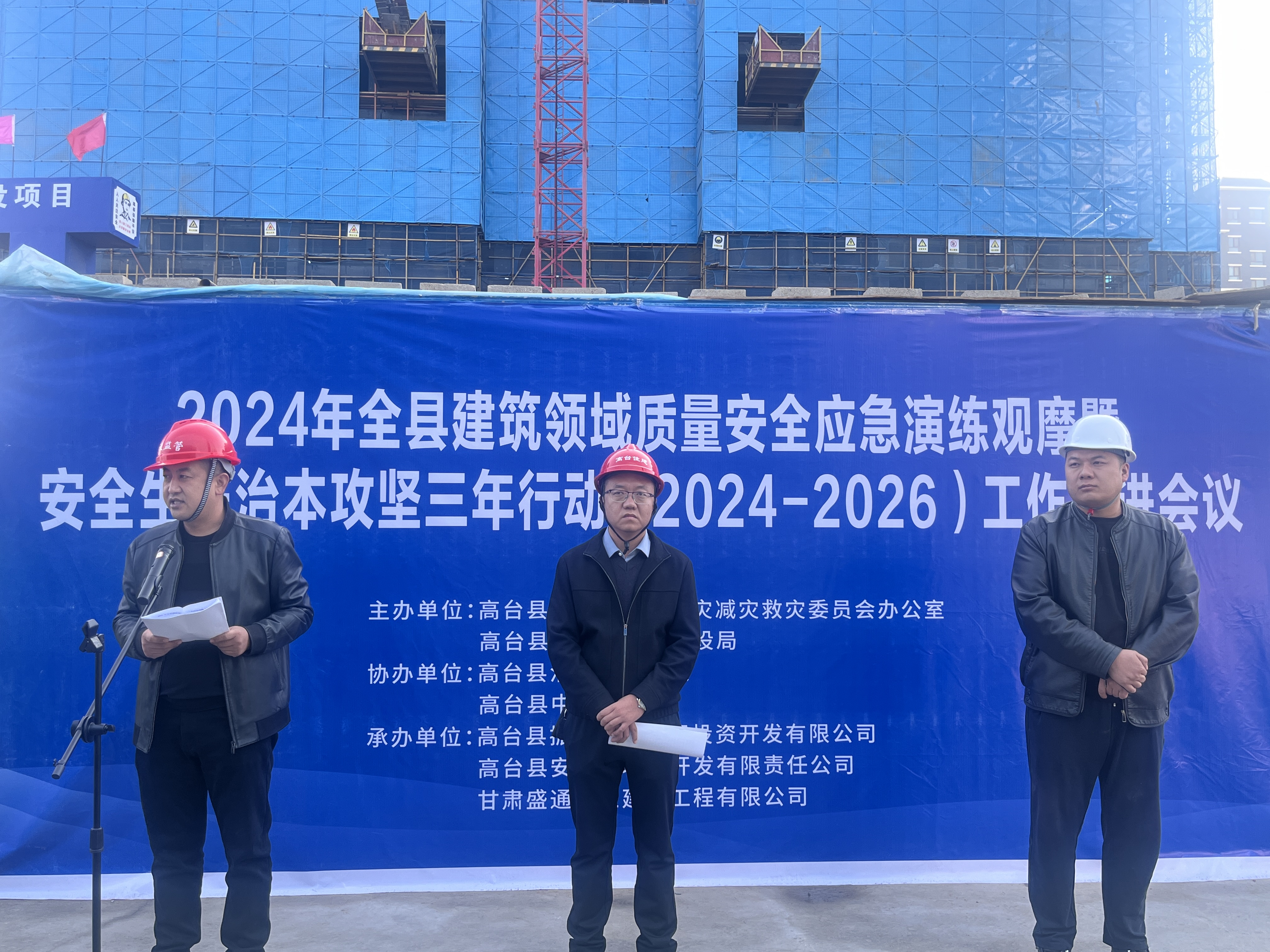 为进一步提高企业应急处突能力,强化施工现场质量安全标准化建设水平,全面推进安全生产治本攻坚三年行动工作,11月8日下午,高台县住建局在北河学府项目工地举办全县建筑领域质量安全应急演练观摩暨安全生产治本攻坚三年行动(2024—2026)工作推进会议。县住建局、县应急管理局、消防大队等相关负责同志,辖区各建设、监理、施工单位主要负责人参加会议。