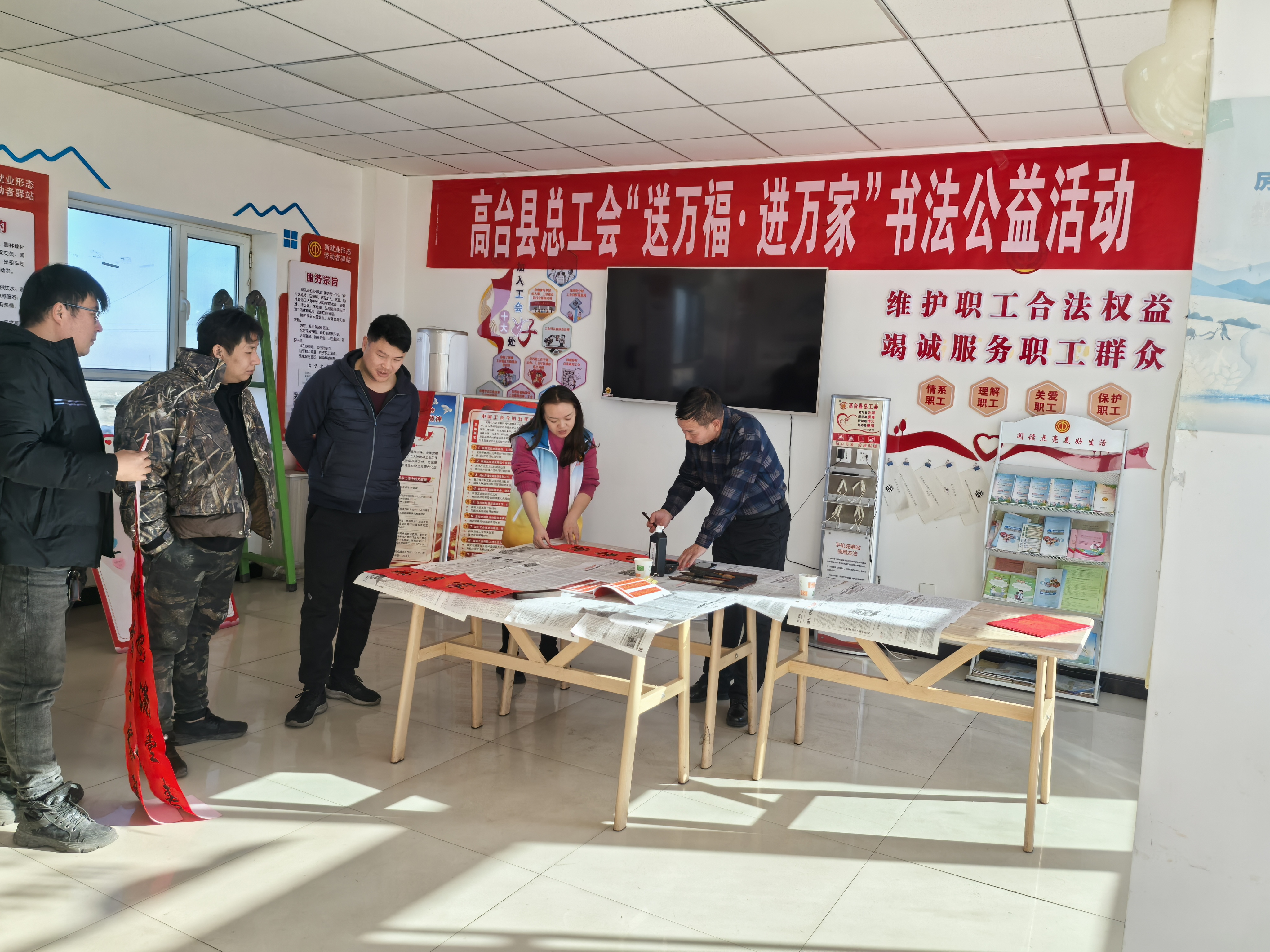 翰墨飘香,万福迎春。1月16日,高台县总工会在新就业形态劳动者驿站高台县元山子加气站开展“送万福、进万家”书法公益活动,为过往的货车司机义务书写春联和“福”字,把美好祝福送到千家万户。