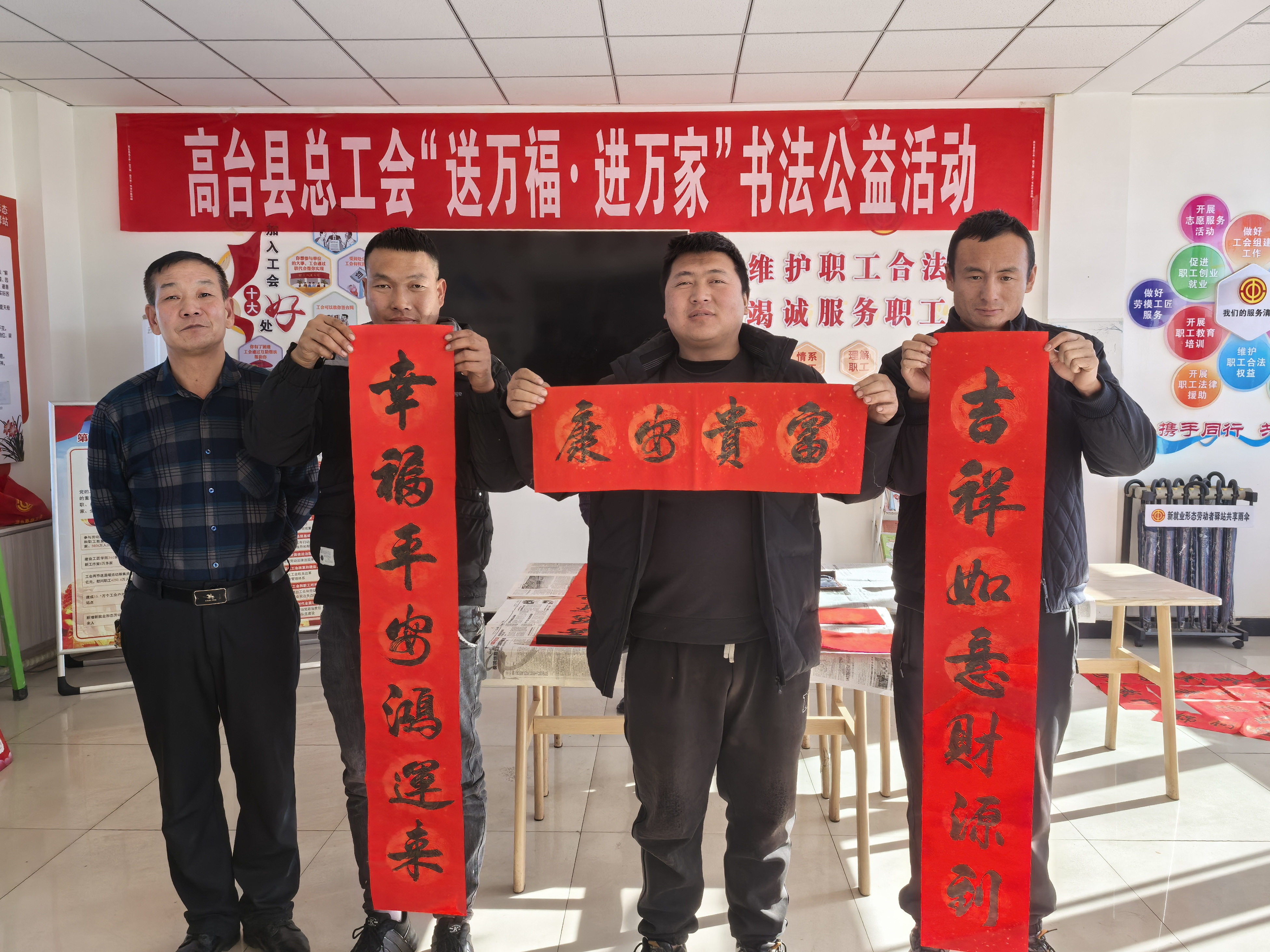 近年来,高台县总工会持续开展“送万福、进万家”书法公益活动,深入基层企业、车间、班组、园区,面向一线职工特别是新就业形态劳动者送去了新年的祝福和温暖,进一步促进了工会与企业间的沟通交流,营造了浓厚的节日氛围,让广大职工群众切身感受到工会对企业和职工的关怀。