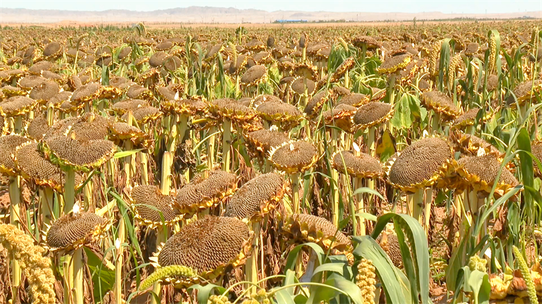 在黑泉镇十坝村的连片葵花种植基地,收割好的花盘整齐地晾晒于葵株之上。阳光下,籽粒饱满油亮,闪烁着乌金般的光泽,将丰收的喜悦与希望,书写在田野之间。种植大户曹玉鹏通过土地规模化流转,推行标准化种植技术,取得了不错的效益。“我种了1400亩葵花,产量(预计)在每亩地230公斤左右,一公斤12.4元。主要发往山东、内蒙古、新疆。”种植大户曹玉鹏说。