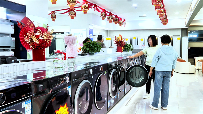 在高台县城一家家电卖场,智能大屏电视、双开门冰箱、滚筒洗衣机等家电产品有序陈列,科技感十足。店内“以旧换新”的标语格外醒目,叠加节庆优惠活动,多重政策红利,不仅让消费者享受到了真金白银的优惠,也为消费市场注入强劲动力。“我看了个冰箱,价格9000块钱,厂家补贴1000块钱,国补补贴20%,大概6500块钱就能买上,我觉得冰箱品质比较好,价格也比较实惠。”市民朱卫海如是说。