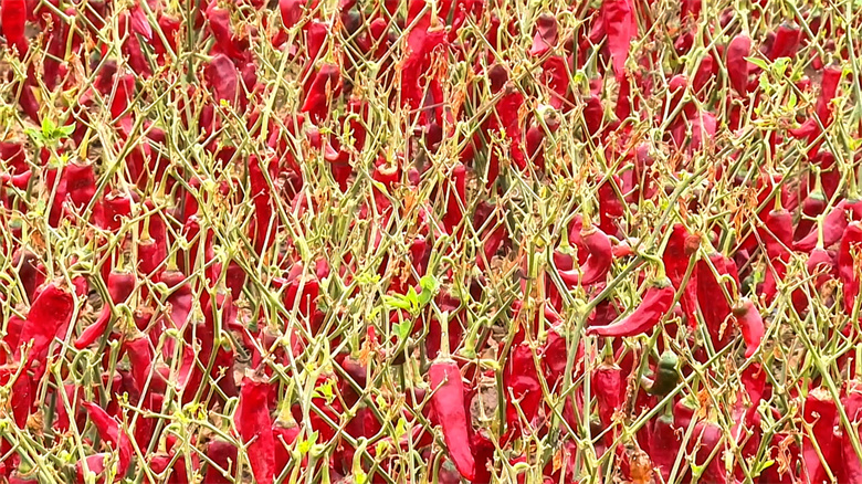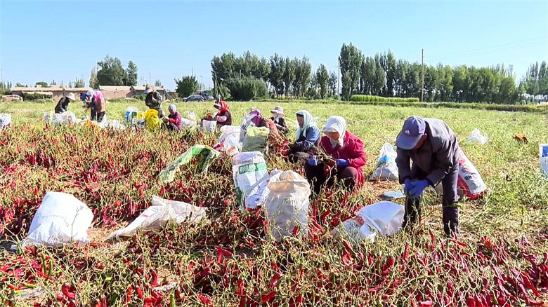 “今年我在这儿种了200亩板椒,主要是采摘晾干后再销售,目前看每亩能收600公斤左右,市场价格大概10元一斤,效益挺可观的。”种植大户曹延生介绍,现在每天都要雇40个左右的村民帮忙采摘,工价是每米1块4,“大家在家门口就能干活挣钱,我也能及时把辣椒收回来,一举两得。”