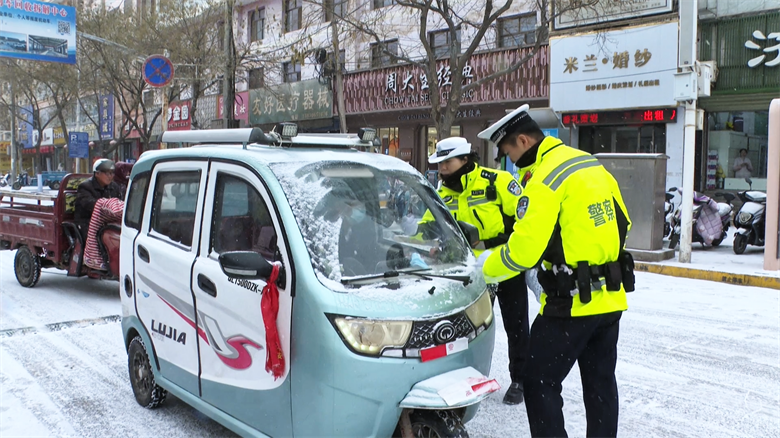 在城乡主要道路、陡坡及易结冰路段,公安交警部门提前部署警力,采取定点指挥与动态巡逻相结合的方式,加强交通疏导与安全提醒。“我们第一时间启动应急预案,全员上路,重点在主干道、坡道引导车流,提醒驾驶员减速慢行、保持车距。”县公安局交通管理大队民警武方方介绍。与此同时,环卫部门及时在积雪路段抛撒融雪剂,多部门联动为雪天出行筑牢安全防线。