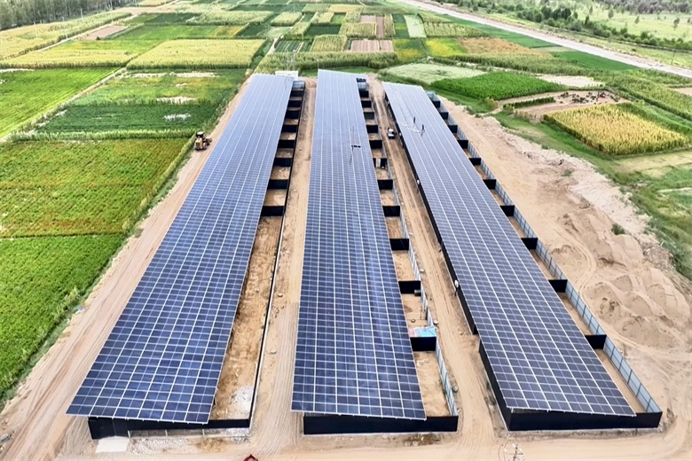 王兴虎口中的“牧光互补省下的费用”,正是得益于高台县创新推行的“棚上发电、棚下养殖”牧光互补模式。2025年,合黎镇通过招商引资,引进企业投资1800万元,在五四村、七坝村、八坝村三个生态及地质灾害避险搬迁安置点的集中养殖区,新建牧光互补圈舍122套,安装分布式光伏5300千瓦。