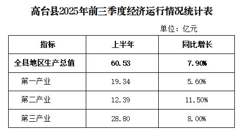 根据地区生产总值统一核算结果,全县地区生产总值60.53亿元,按不变价格计算,同比增长7.9%。分产业看,第一产业增加值19.34亿元,增长5.6%;第二产业增加值12.39亿元,增长11.5%;第三产业增加值28.8亿元,增长8%。