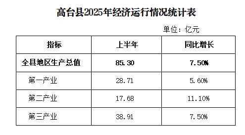 根据地区生产总值统一核算结果,全县地区生产总值85.3亿元,按不变价格计算,同比增长7.5%。分产业看,第一产业增加值28.71亿元,增长5.6%;第二产业增加值17.68亿元,增长11.1%;第三产业增加值38.91亿元,增长7.5%。