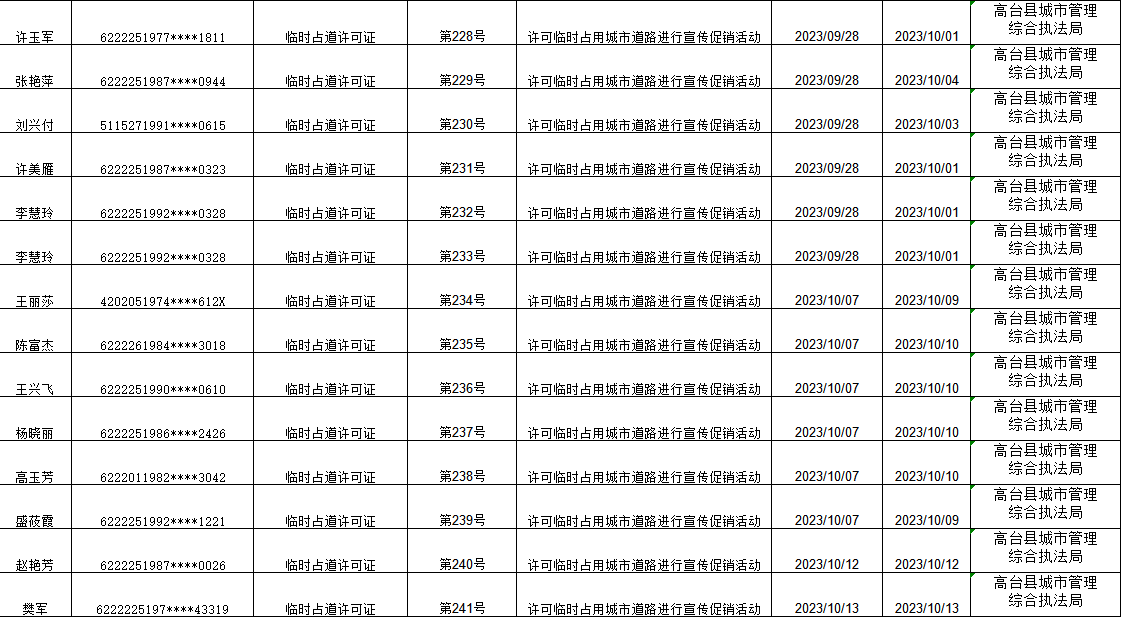 现将高台县城区临时占道摊位自然人行政许可信息(10月)公开如下: