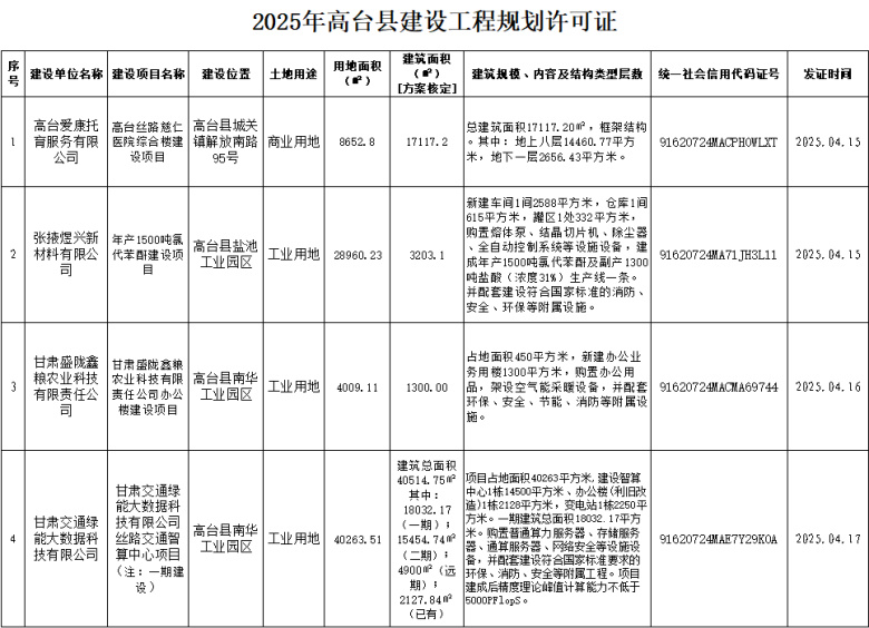 现将2025年4月高台县建设工程规划许可证公示如下: