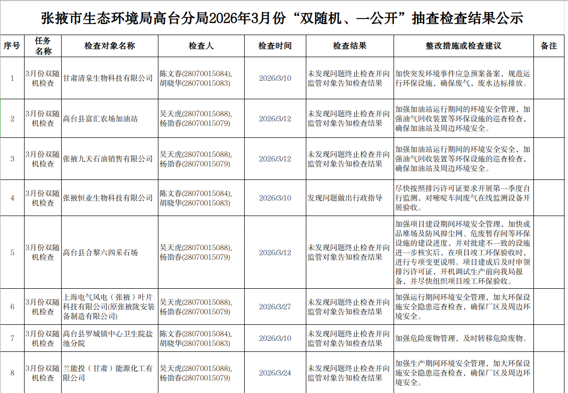 现将张掖市生态环境局高台分局2026年3月份“双随机、一公开”现场检查情况公示如下: