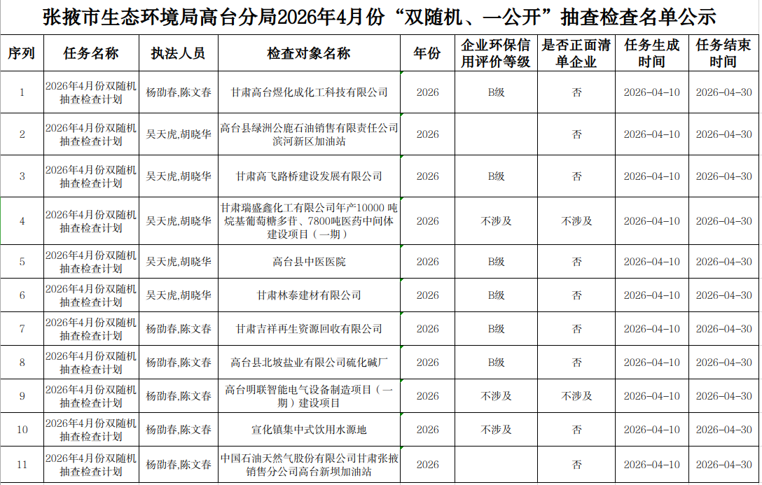 按照“双随机、一公开”工作公示要求,现将2026年4月份“双随机、一公开”现场检查抽查对象予以公示,接受公众监督。