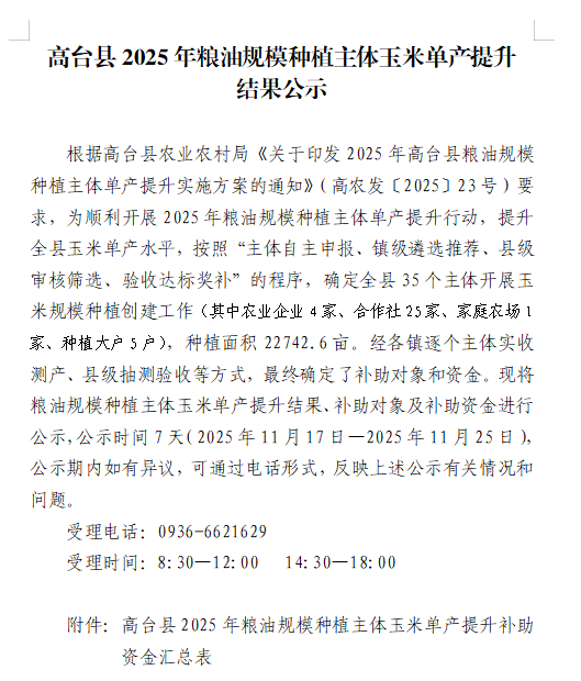 高台县2025年粮油规模种植主体玉米单产提升结果公示