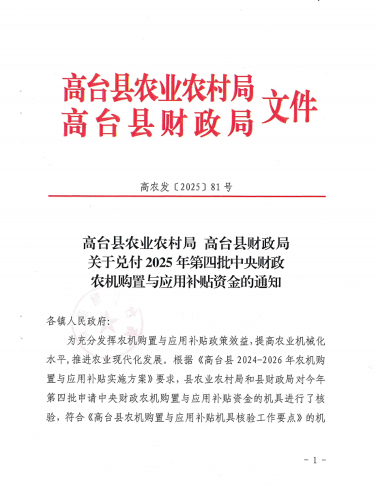 高台县农业农村局 高台县财政局关于兑付2025年第四批中央财政农机购置与应用补贴资金的通知