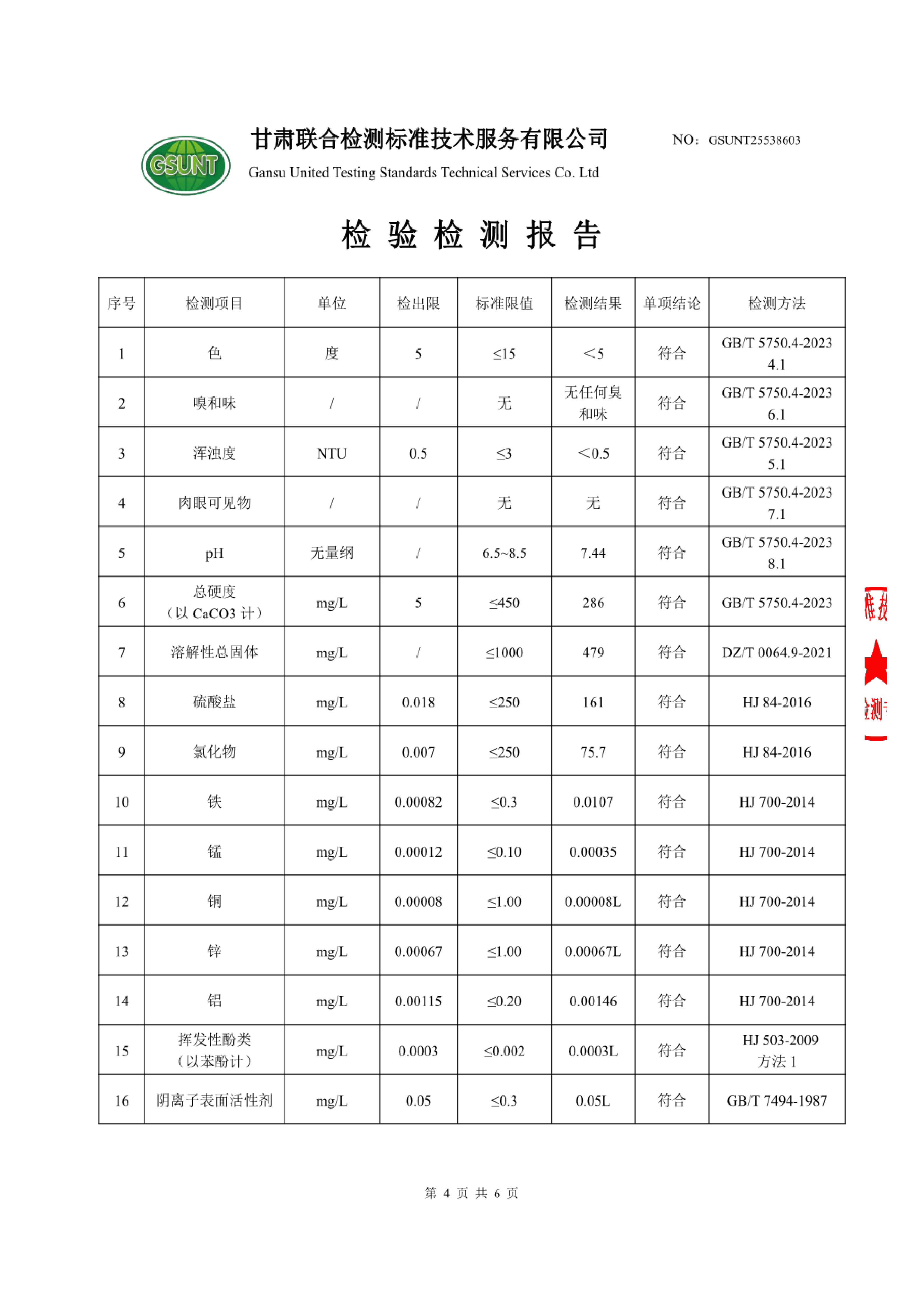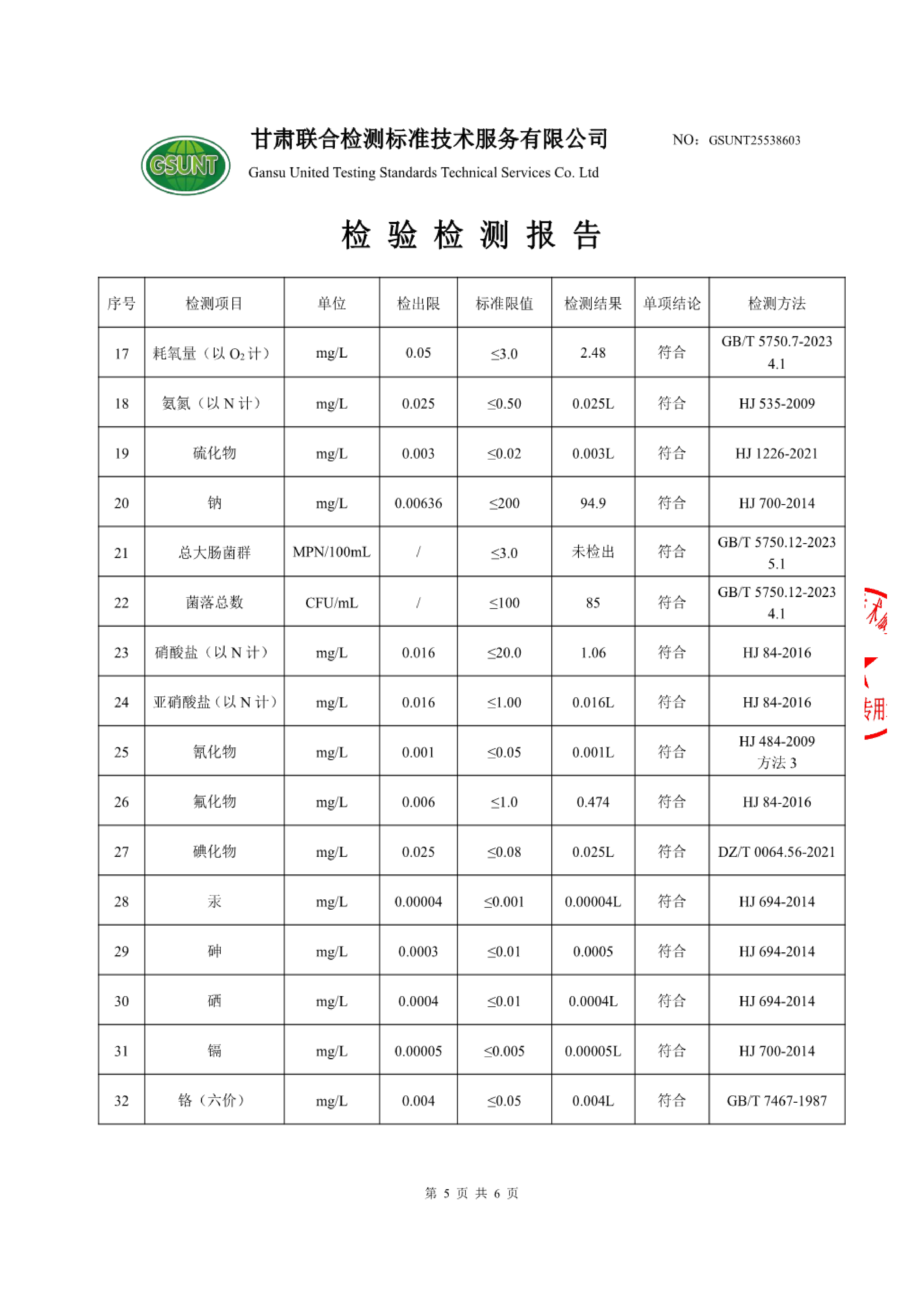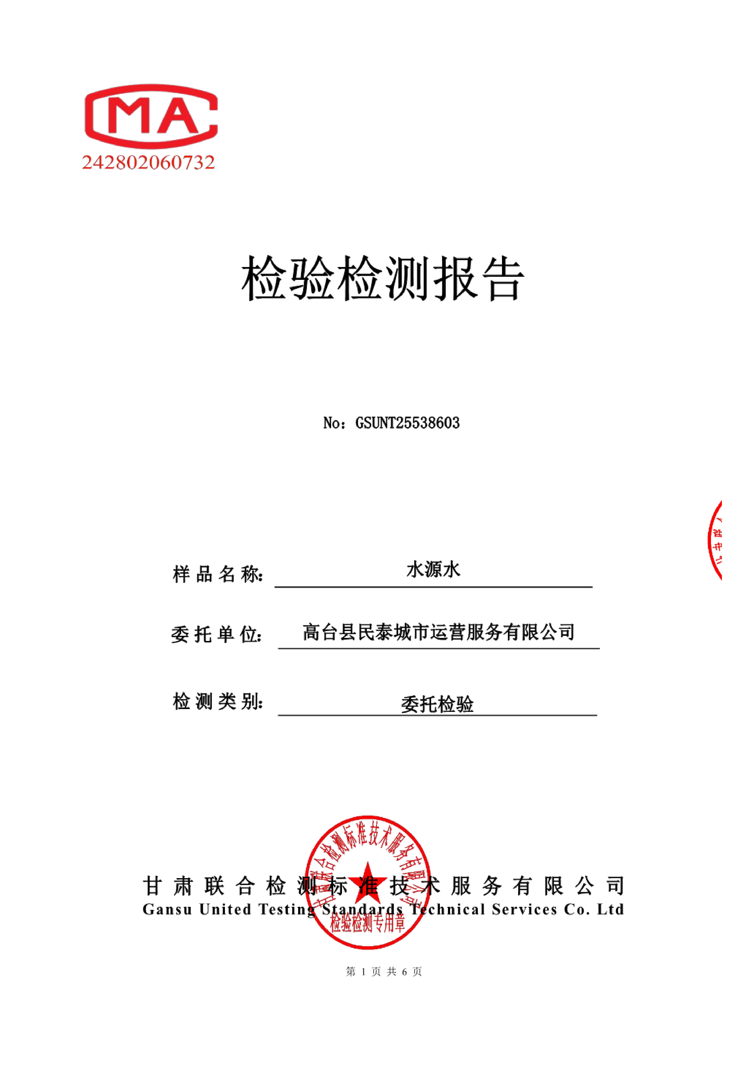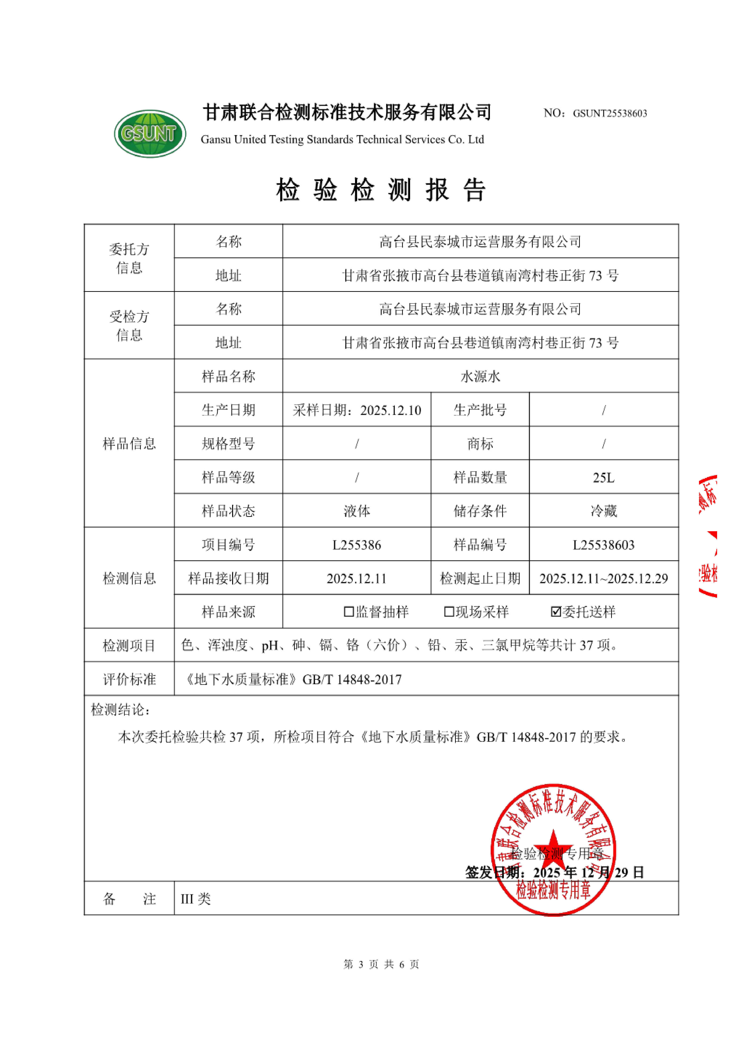 高台县城区饮用水2025年12月份水质(水源水)检测报告