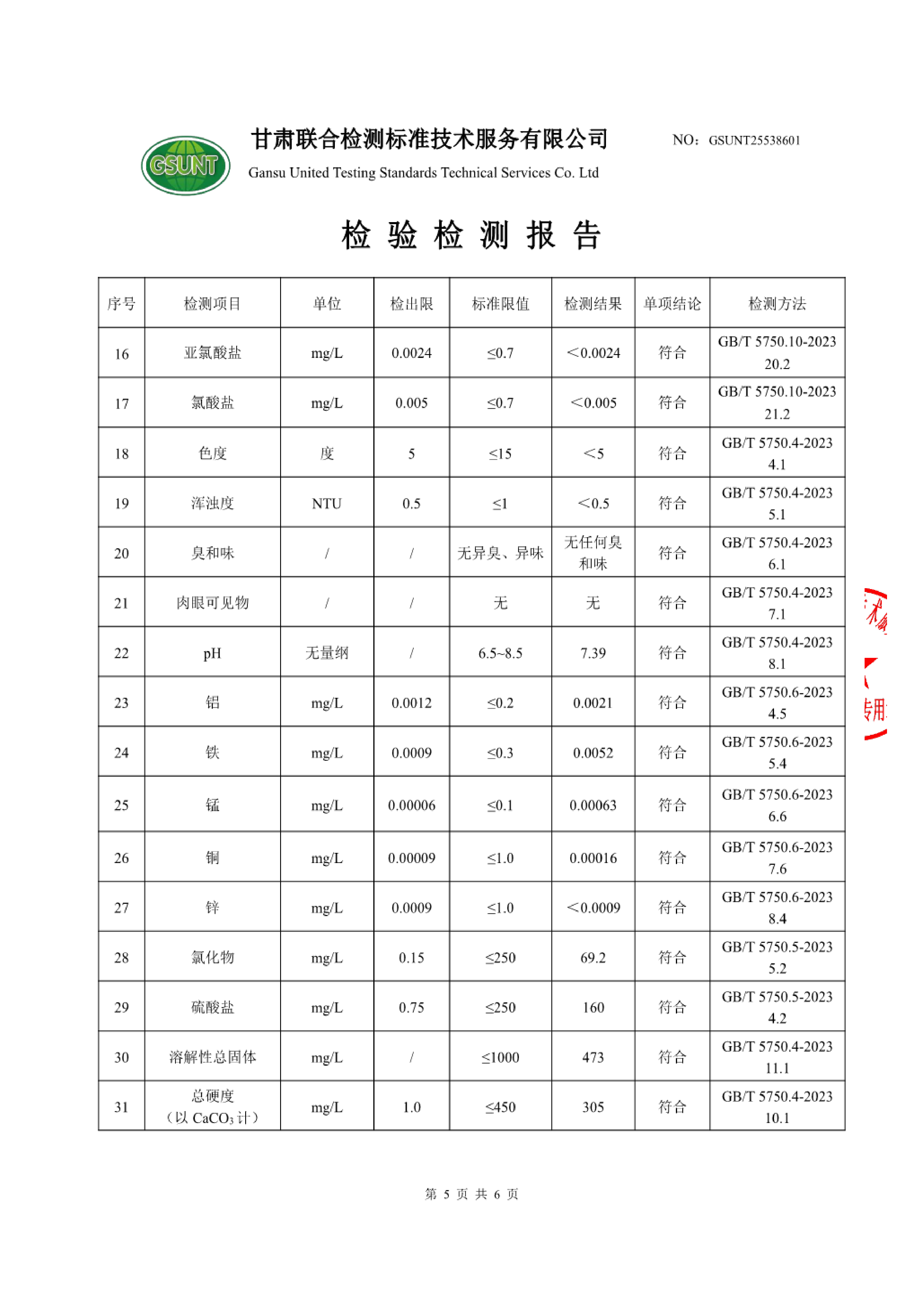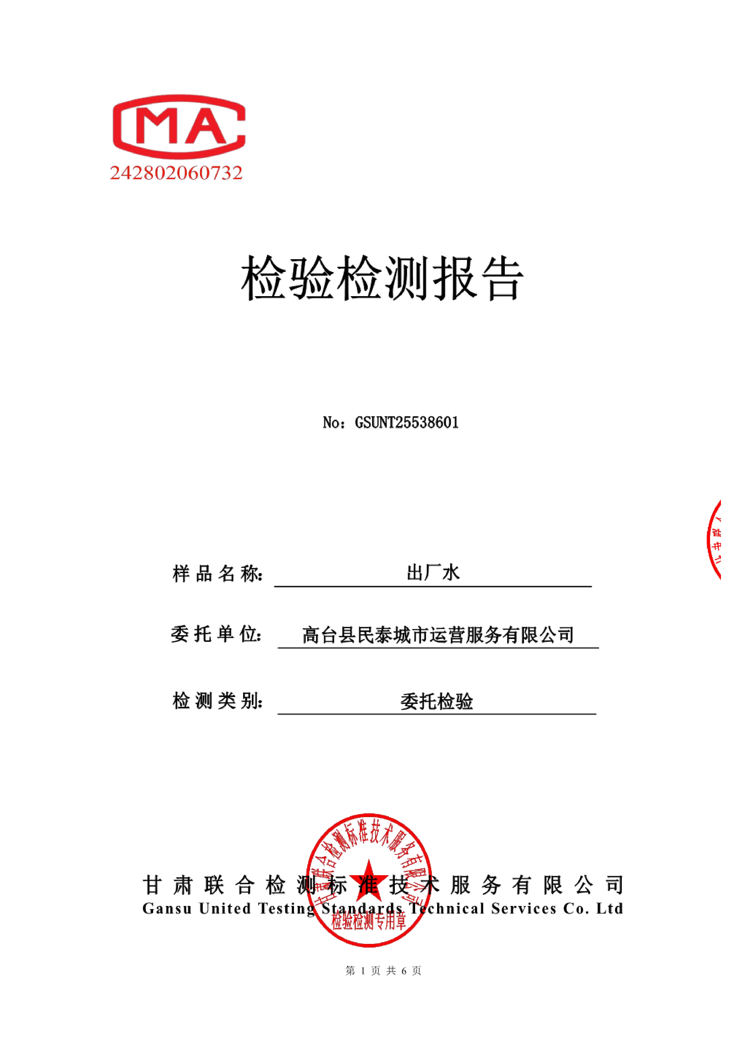 高台县城区饮用水2025年12月份水质(出厂水)检测报告