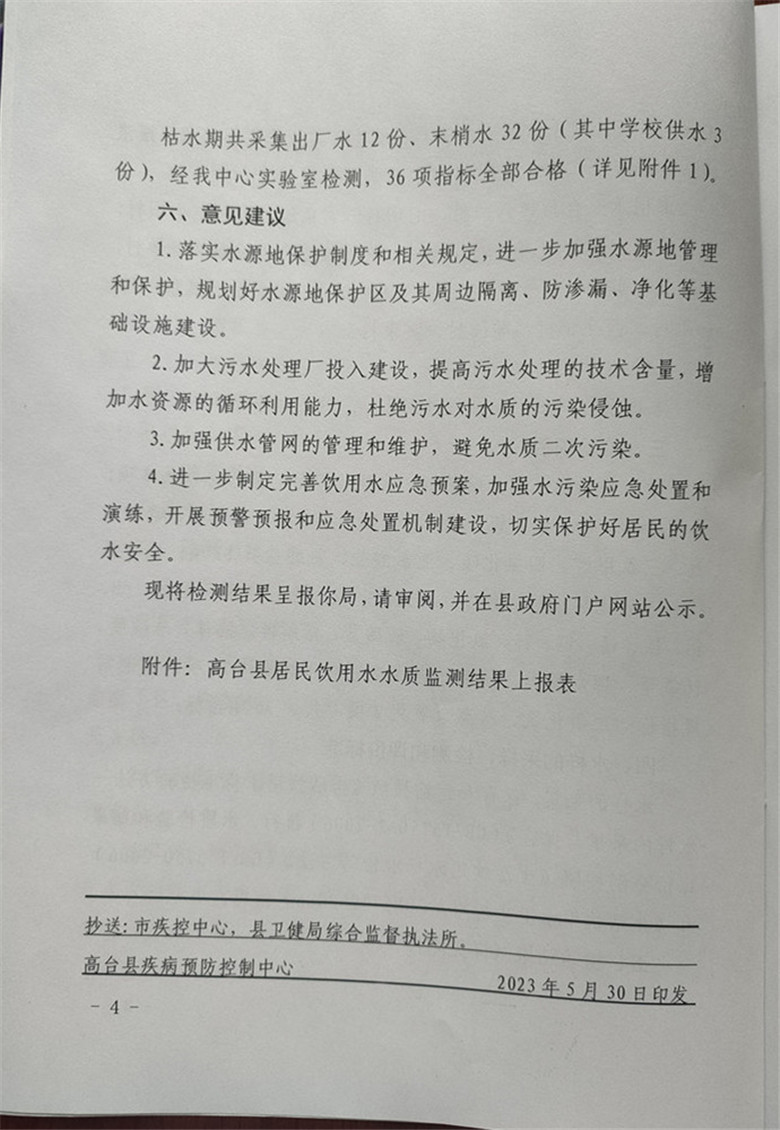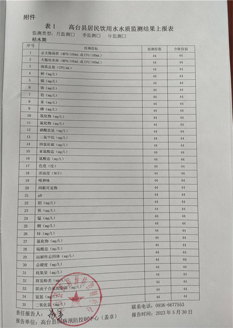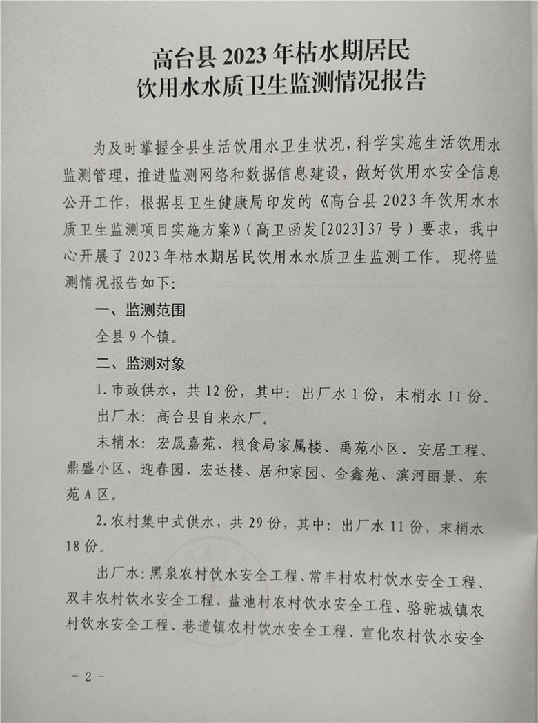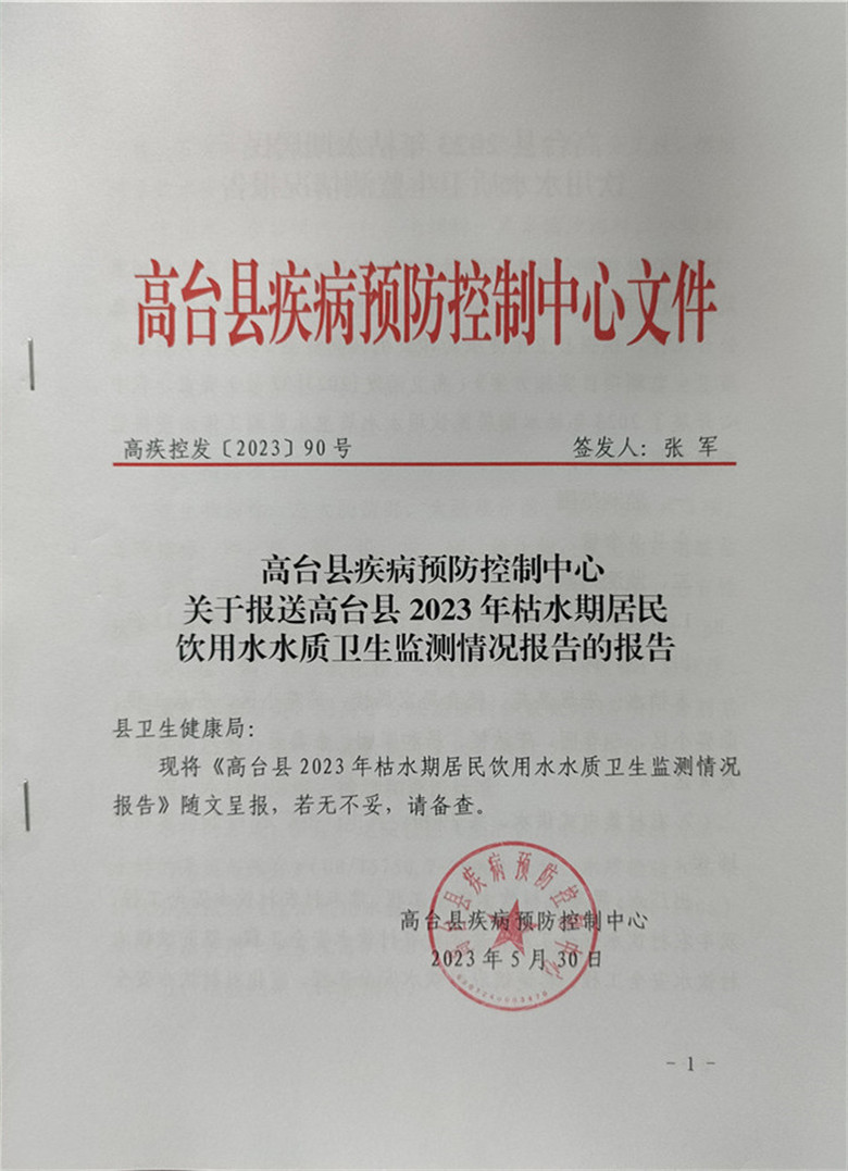 关于报送高台县2023年枯水期居民饮用水水质卫生监测情况报告的报告