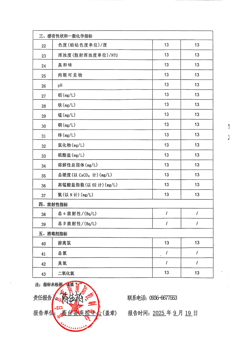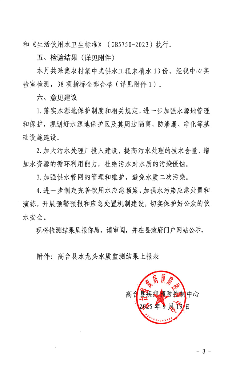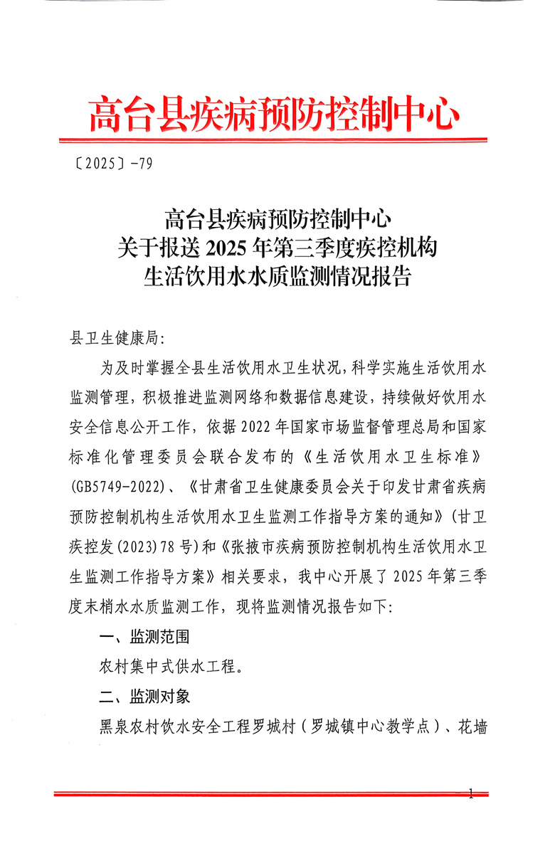 高台县2025年第三季度疾控机构生活饮用水水质监测情况报告