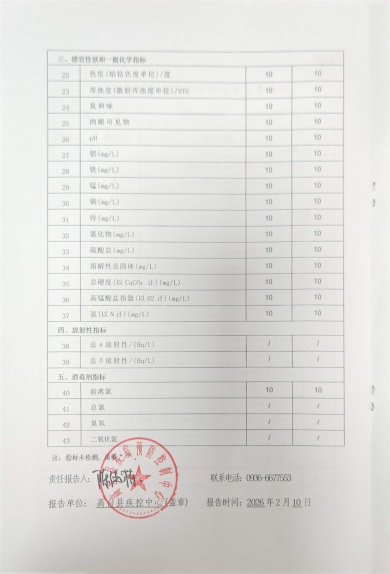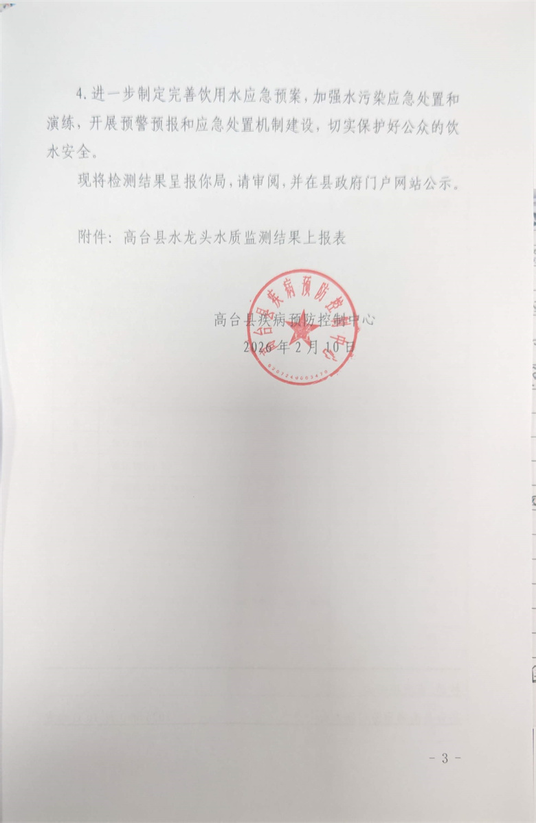 高台县2026年2月份疾控机构生活饮用水水质监测情况报告