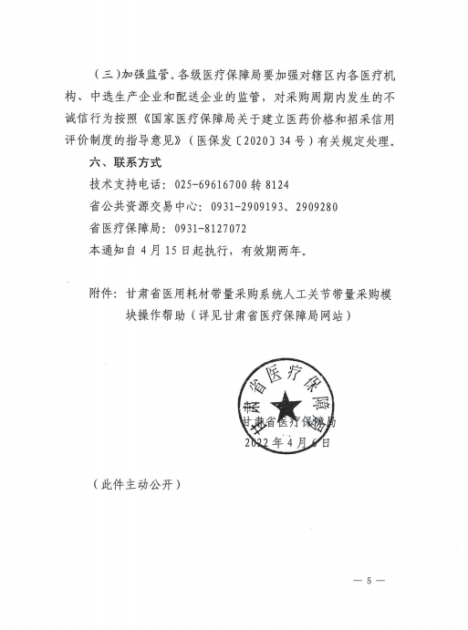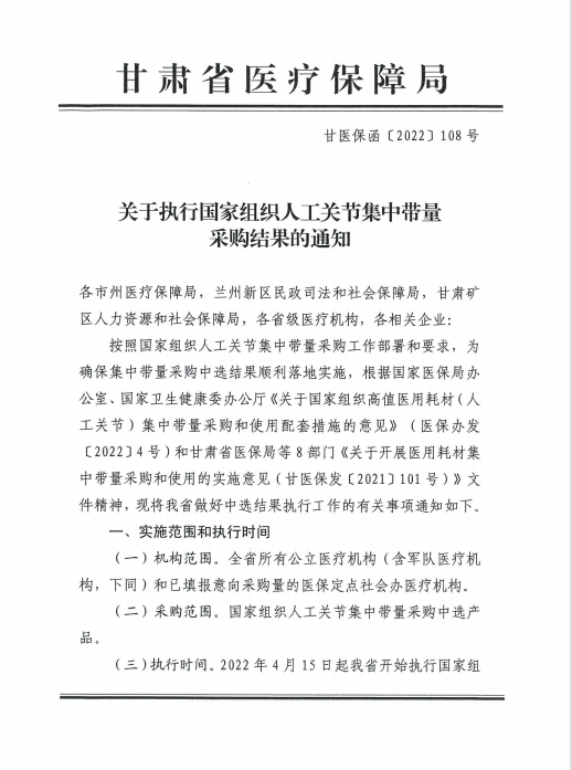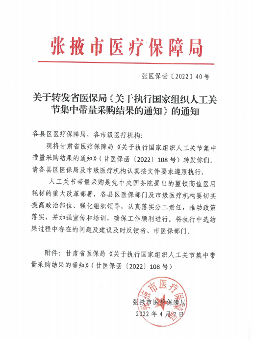张掖市医疗保障局关于转发省医保局关于执行国家组织人工关节集中带量采购结果的通知