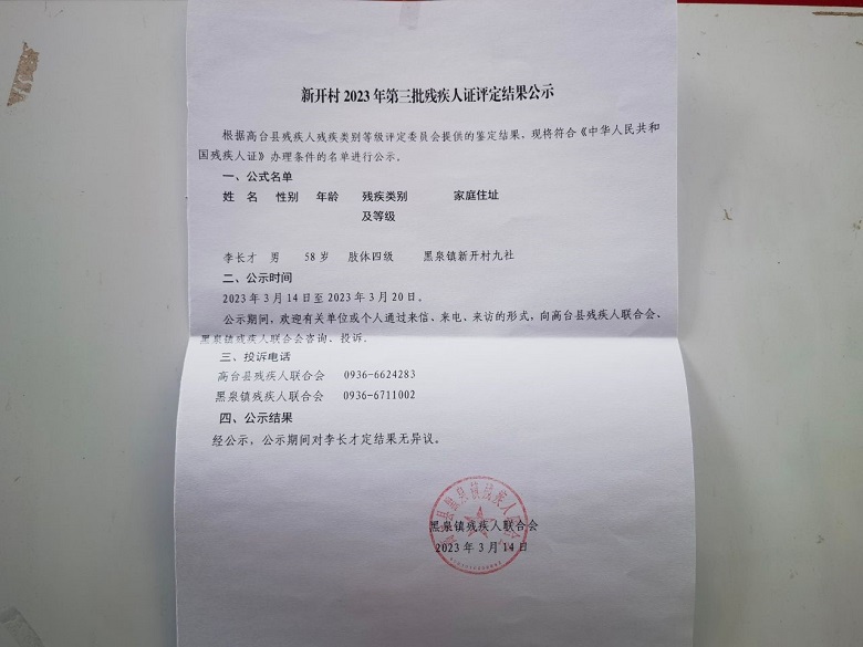 黑泉镇新开村2023年残疾人证评定结果公示