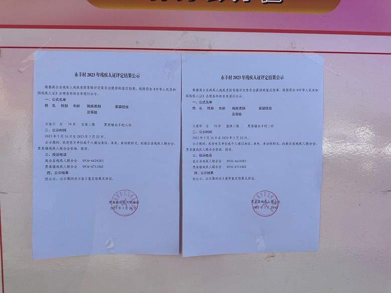 黑泉镇永丰村2023年残疾人证评定结果公示