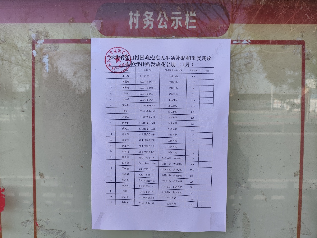 现将2026年1月份罗城镇红山村困难残疾人生活补贴和重度残疾人护理补贴发放情况公开如下: