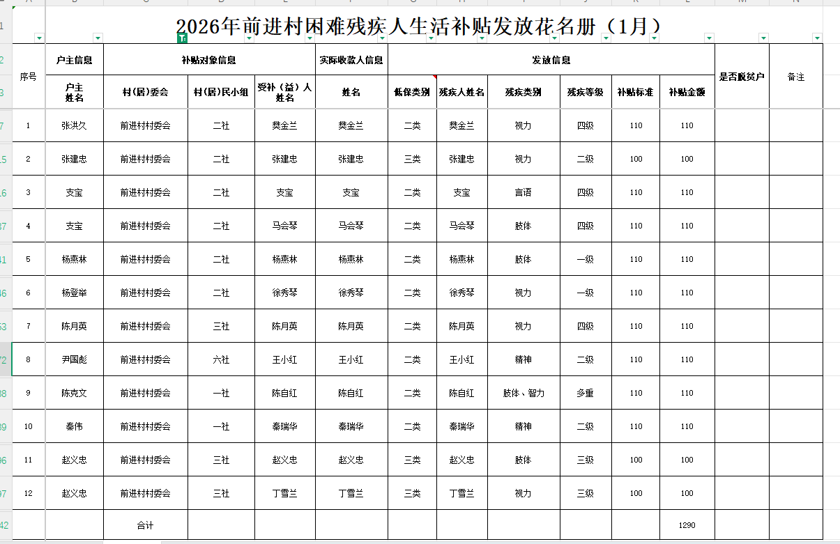 2026年前进村困难残疾人生活补贴发放花名册(1月)