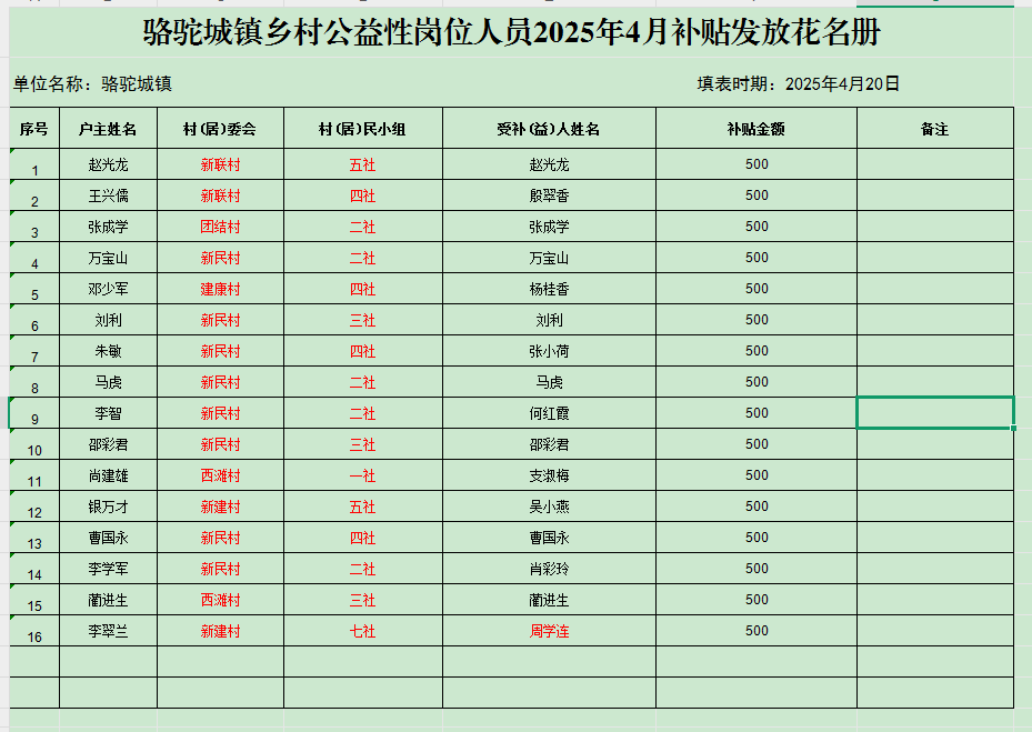 骆驼城镇乡村公益性岗位人员2025年4月补贴发放花名册