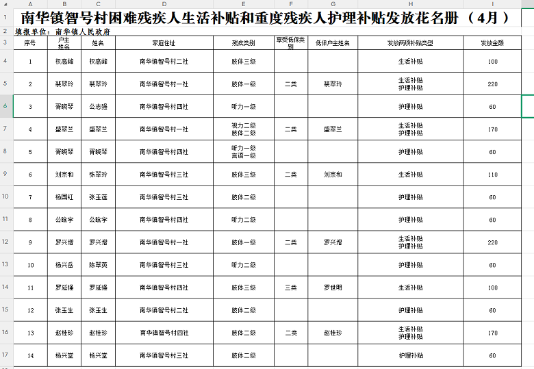 现将南华镇智号村困难残疾人生活补贴和重度残疾人护理补贴发放花名册(4月)公开如下: