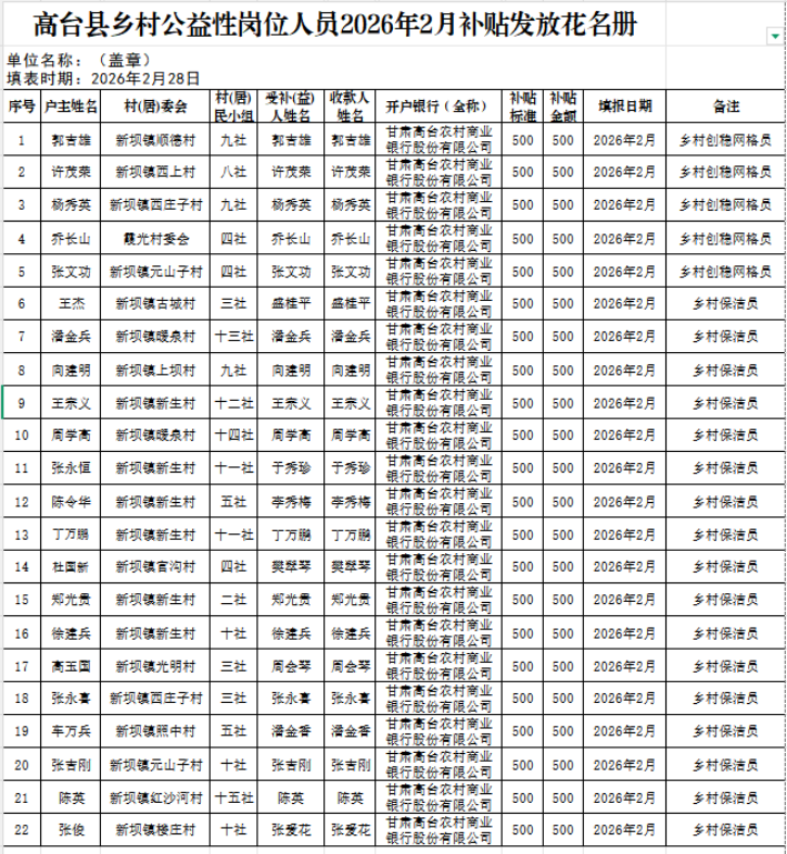 新坝镇2026年2月乡村公益性岗位人员发放花名册(保洁环卫、创稳网格员)