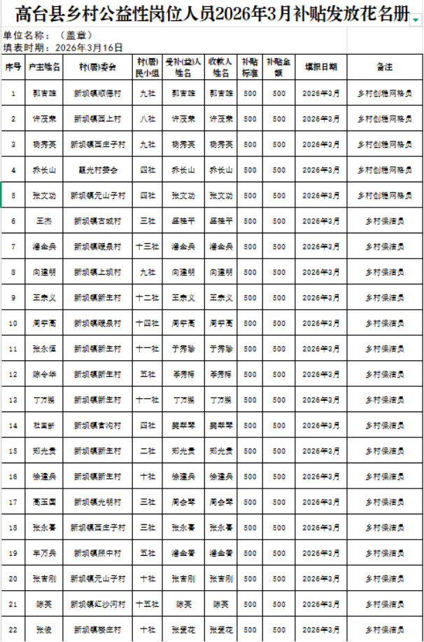 新坝镇2026年3月乡村公益性岗位人员发放花名册(保洁环卫、创稳网格员)