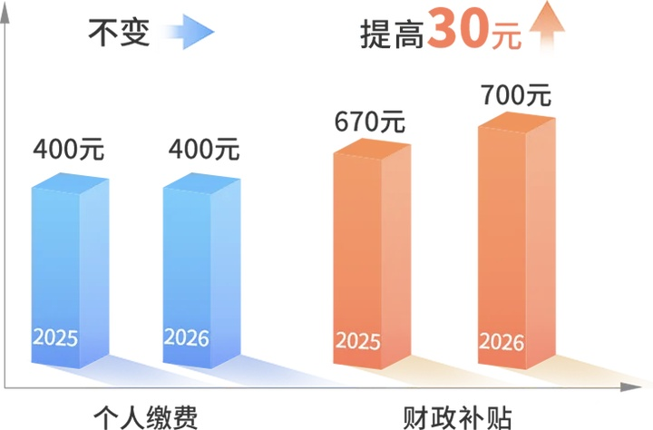 个人缴费没涨,财政补贴较上年提高30元。2026年度城乡居民医保个人缴费标准400元/人/年,财政补助不低于700元/人/年。