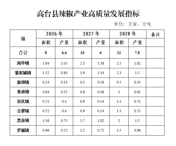 1.规模与产量:全县辣椒种植面积稳定在12万亩左右,总产量达到7.8万吨以上,单产水平较2025年提高20%以上,标准化种植率达到90%以上,构建稳定、高效原料供应基地。
