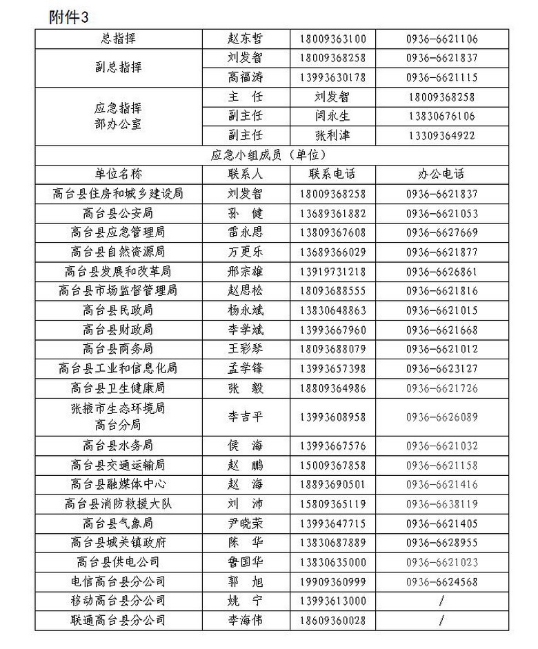 电信高台县分公司、移动高台县分公司、联通高台县分公司:负责通信保障工作。